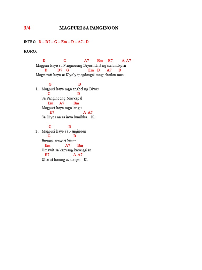 Luwalhati at papuri ialay sa Panginnon. Refrain Bm Em A7 D F O ating purihin ang Poon na mahabagin sa atin. Bm Em Magpasalamat kayo sa Panginoon A7 D.