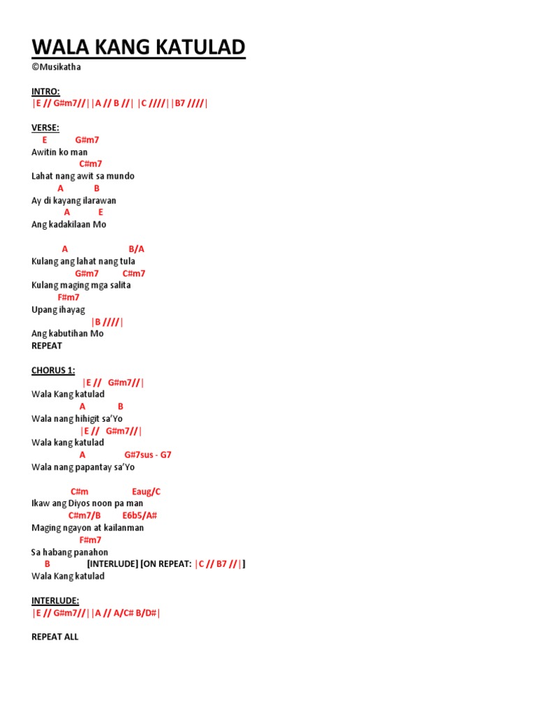 Em D G A Fm Bm F Cm B Chords for Wala Kang Katulad Awitin Ko Man wLyrics and Chords with song key BPM capo transposer play along with guitar piano ukulele mandolin. Wala kang katuladby Sherwin Bob DiazArranged Produced Performed by Power Worship PHMicah PascuavocalsUel MironkeyboardsArie EpistolaBassDrumssynthM. Kahit ipunin kong kayamanan ng mundo Di pa rin tutulad sa kadakilaan Mo Kahit ibigin ko lahat ng uri ng tao Di pa rin tutulad sa dakilang pag-ibig Mo Walang katulad ang kapangyarihan Mo Walang katulad ang dakilang pag ibig Mo Diyos kat hari ng mga hari Panginoon ng panginoon Purihin ka Ama sa habang panahon Back to verse II Back to chorus 2x.
