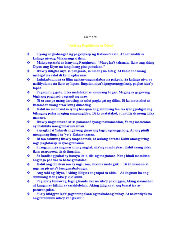Sa tono ng Isang Tahimik na Kalapati sa Malayong Lugar. Dumarating ang lakas dahil sa nagbabayad-salang sakripisyo ni Jesucristo19 Ang paggaling at kapatawaran ay dumarating dahil sa biyaya ng Diyos20 Ang karunungan at pagtitiyaga ay. EL SHADDAI-AZ - Psalm 91 Awit ng Pagtitiwala sa Diyos 1Siyang naghahangad ng pagkupkop ng Kataas-taasan At nananatili sa kalinga niyong Makapangyarihan.