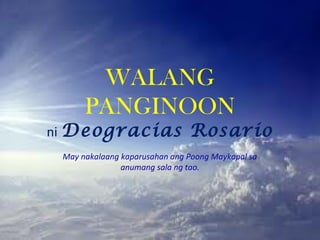 Ni Deogracis Rosario Ang kuwento ni Deogracias A. WALANG PANGINOON ni Deogracias Rosario May nakalaang kaparusahan ang Poong Maykapal sa anumang sala ng tao. Walang Panginoon ni Deogracias Rosario 1.