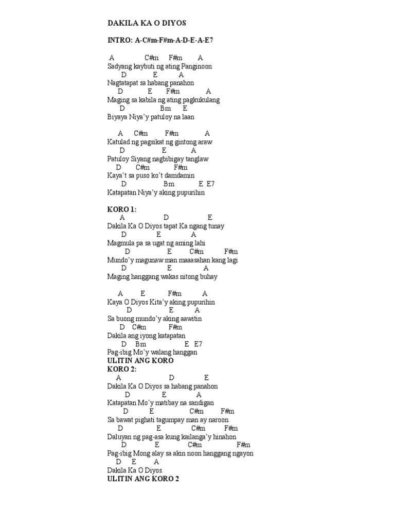 The duration of the song is 426. Chorus Dakila ka O Diyos Tapat ka ngang tunay magmula pa sa ugat ng aming lahi Mundoy magunaw man maaasahan kang lagi Maging hangang wakas nitong buhay Kaya o Diyos ikay aking pupurihin Sa buong mundoy aking aawitin Dakila ang iyong katapatan Pag-ibig moy walang hangan repeat Chorus Dakila ka O Diyos Sa habang panahon. Verse 1 G Ako Sayoy Lumalapit G Em C Dala-dala ang awit ng Pasasalamat G F Em Sa Lahat ng Yong Gawa G Ako Sayoy sumasamo G Em C Punong-puno ang puso ng.