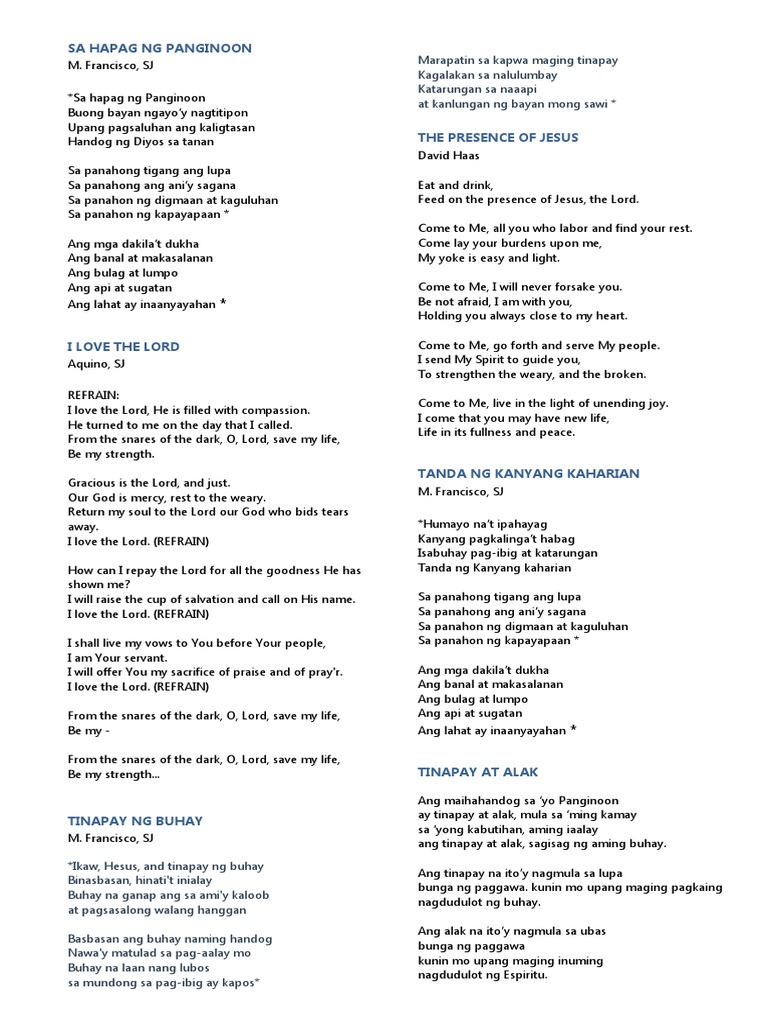 Sa panahong tigang ang lupa sa panahong ang aniy sagana Sa panahon ng digmaan at kaguluhan sa panahon ng kapayapaan. SA HAPAG NG PANGINOON. Sa piging ng ating Panginoon tayoy laging natitipon Upang matutong magmahalan.