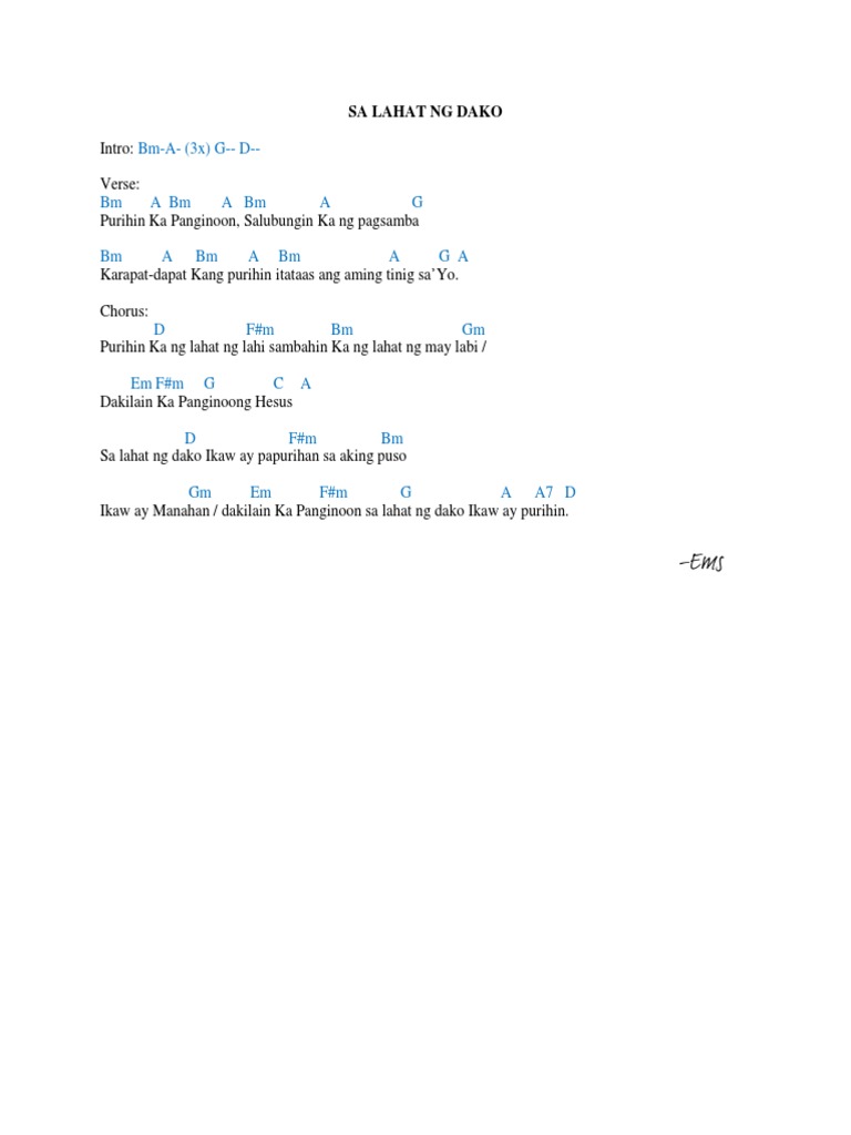 Please email us at jesuitmusicministry gmail. Magpuri kayo sa Panginoong Diyos Bm E7 A A7 lahat ng santinakpan. C G C G.