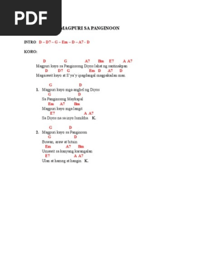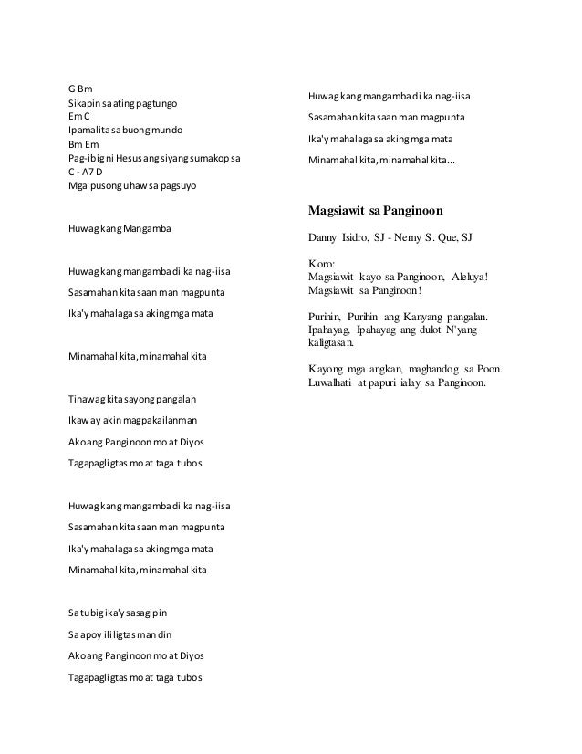 Magsiawit tayo sa panginoon lyrics. D A7 Bm D7 PURIHIN AND PANGINOON G B7 Em UMAWIT NG KAGALAKAN G A7 D Bm AT TUGTUGIN ANG GITA-RA Em A7 F7 B7 AT ANG KAAYA-AYANG LIRA Em A7 D HIPAN NINYO ANG TROMPETA Am7 D7 G Em SA ATING PAGKABAGA-BAG Am7 D7 G SA DIYOS TAYOY TUMAWAG Bb C7 F Dm SA ATING MGA KAA- WAY Gm Asus A A9 A7 TAYO AY KANYANG. KORO Purihin ang Panginoon Umawit ng kagalakan At tugtugin ang gitara At ang kaaya-ayang lira. KORO Ipinaskil ni Jin sa 415 AM.