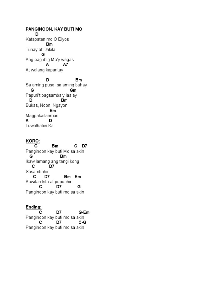 Panginoon kay buti mo Verse 1 G G Fm7 D Panginoon kay buti mo sa amin G G Fm7 D Ikaw lamang ang tangi kong. Chorus C D Bm Em Napakabuti Mo Aming Diyos Ama Am D G G7 Iyong likha luluwalhatiin Ka C D Bm Em Napakabuti Mo Di ka nagbabago Am Bm Am Bm Noon Ngayon Kailan pa man Am Bm C G Sa buhay koy tapat Verse 1 G D O Diyos na napakabuti G D Sayo akoy lumalapit C G C G. Ab Bb Eb Cm.