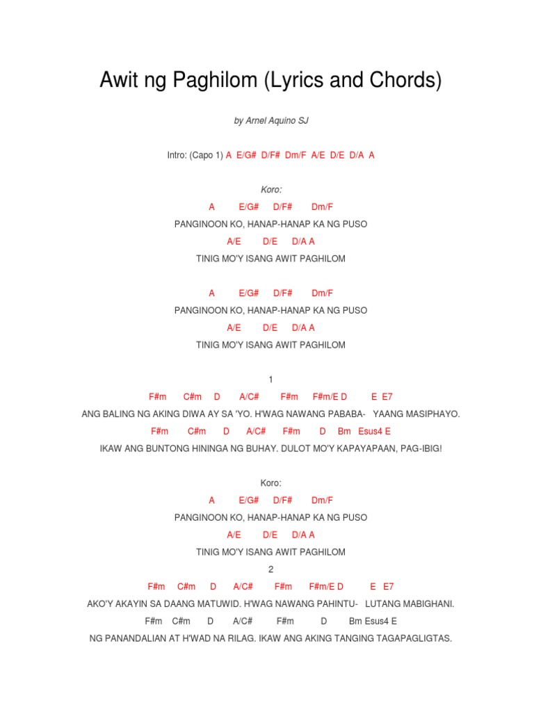 Tinig Moy isang awit PAGHILOM Peace is felt when the heart is at prayer. Lyrics for Awit Ng Paghilom by Arnel DC Aquino SJ. Music and lyrics by.
