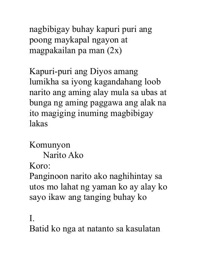 Bawat huni ng ibon sa pag-ihip ng amihan Wangis Moy aking natatanaw Pagdampi ng umaga sa nanlamig kong kalamnan Init Moy pangarap kong hagkan. Sa kasulatan Yong turo. Panginoon Narito Ako by HIMIG SAN LORENZO RUIZ CHOIR Info.