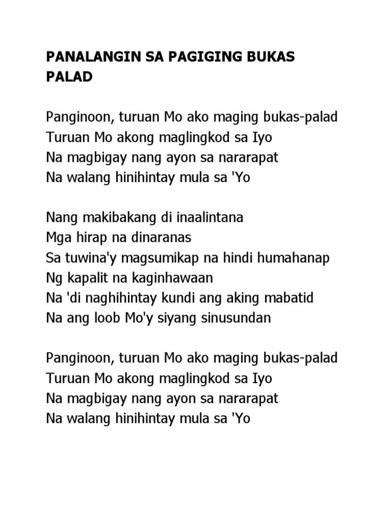 Verse D AC Bm A Kay buti-buti mo Panginoon G A Sa lahat ng oras sa bawat araw D AC Bm A Ikay laging tapat kung magmahal G Ang Iyong kaawaan A D D7 Ay magpawalang-hanggan Chorus G A D Bm. SA LAHAT NG ORAS SA BAWAT ARAW. Intro D-Bm-Em-Asus-A Verse D Bm Katapatan Mo Oh Dios tunay at dakila Em Asus-A Ang pag-ibig Moy wagas at walang kapantay D Am-D7 G Gm Sa aking puso sa aking buhay papurit pagsambay iaalay.