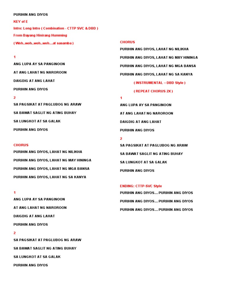 Purihin Mo Ang Dios Oh Pilipinas. Awitan Siya Luwalhatiin Siya. Halinat purihin ang Diyos Pagpapala Niya sa atin lubos-lubos Makapangyarihan Siya sa atin nagmamahal Halinat Siya ay pasalamatan CHORUS Dakilang Diyos at Panginoon Maghari Ka.